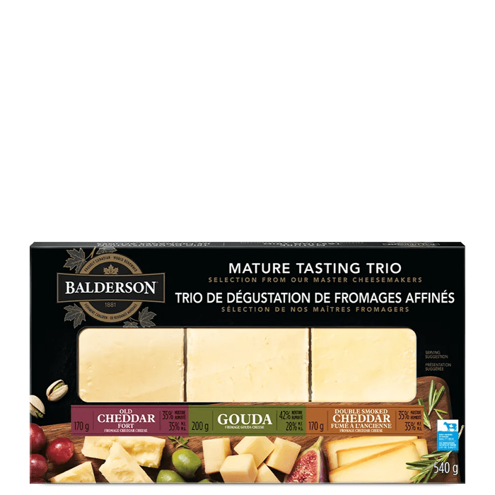 A tasting trio made up of our most delicious cheeses: Old Cheddar, Aged Gouda, and Double Smoked Cheddar, these individually wrapped servings are perfect for snacks, lunches, or on the go.